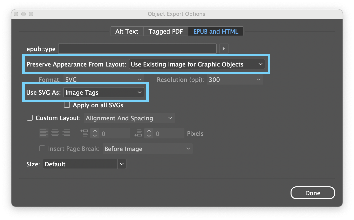 Or, to apply this setting to all images, configure it in the EPUB Reflowable Export Options dialog. Select “Use Existing Image for Graphic Objects”, and set “Use SVG As” to “Image Tags”.