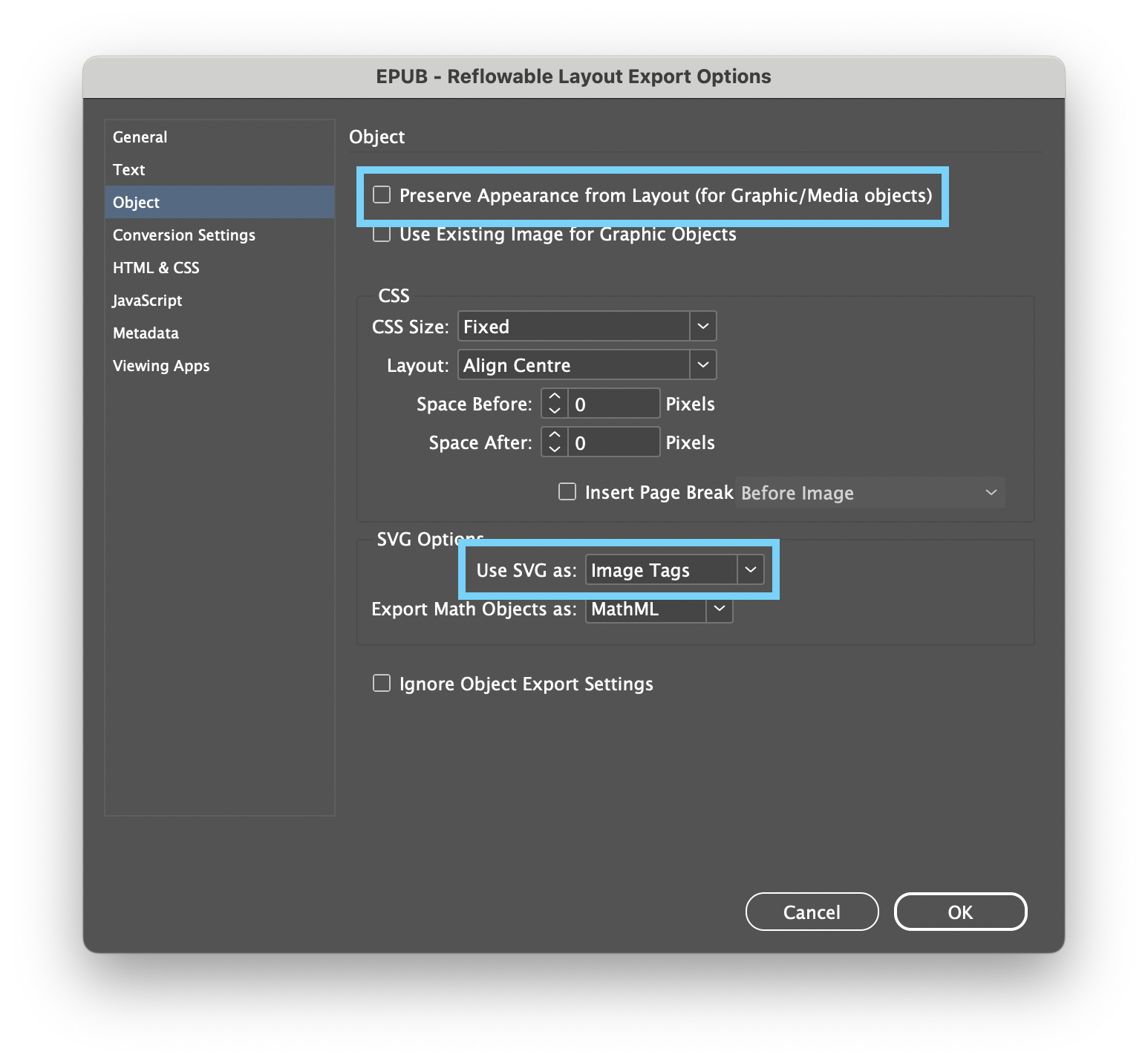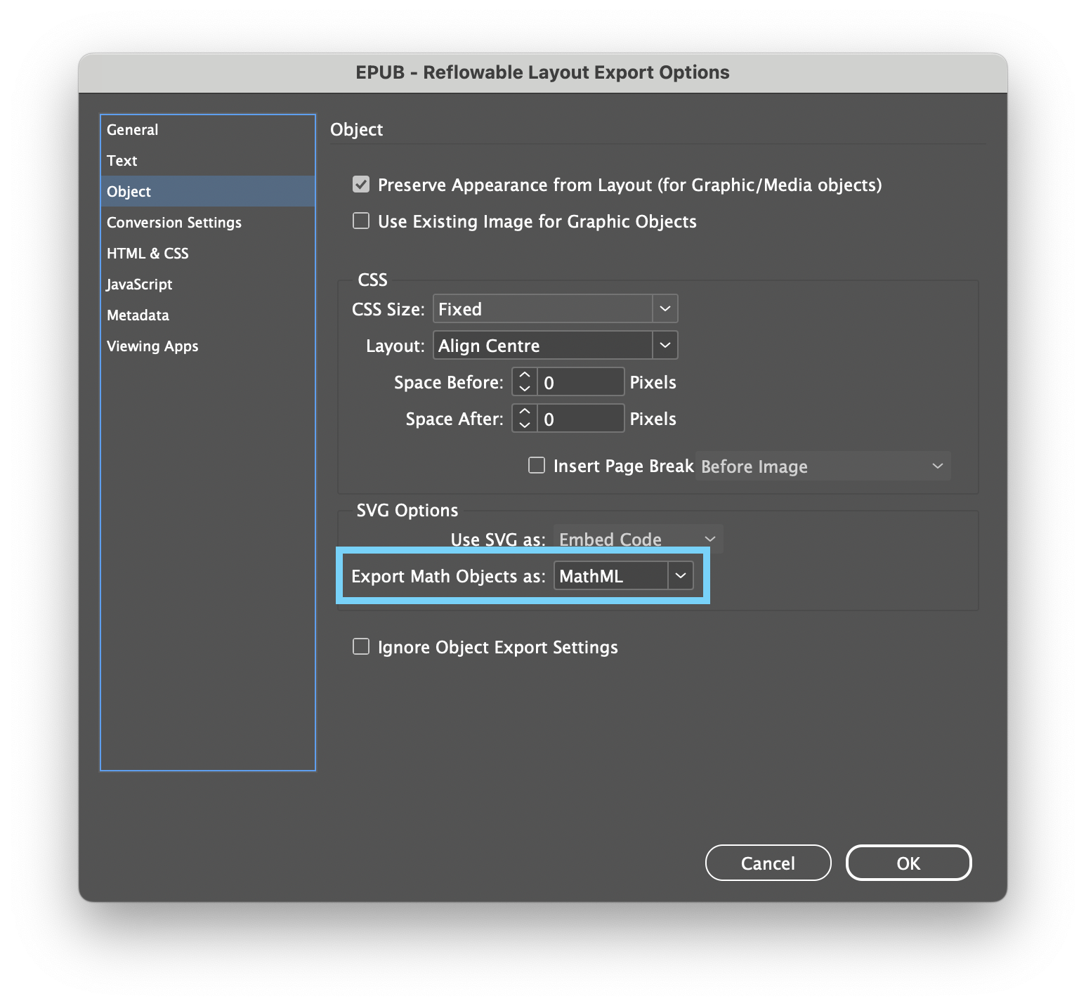 The reflowable EPUB export dialog now includes an option to choose between exporting math as SVG or MathML, under the Object tab.