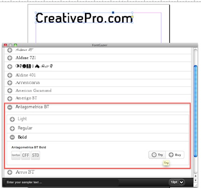 Here’s the fun part. You now have the option to Try or Buy. Click the Try button and the type in your layout changes to that font. Click on another and the font changes accordingly. You cannot select individual words in the text frame, however. The test font applies to all the words in the frame. To test different fonts on multiple words, you need to create a separate text frame for each.