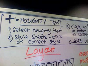 But when I wandered into one of their empty seminar rooms, I had to pull out my iphone for a quick snapshot. They obviously taught InDesign in this room, and had been on the subject of paragraph and character styles when the teacher had left this on the classroom whiteboard: