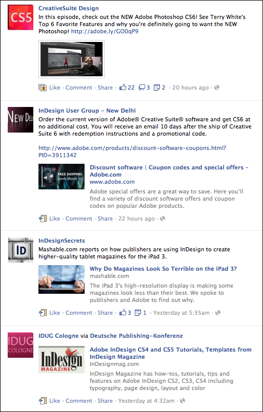 Unlike regular Friends lists, you can only add Pages, not personal Facebook accounts, to an Interest Group list. I spent some time this past weekend hunting down Pages that are specifically about InDesign (and tried to stay away from more general Creative Suite pages). There is an InDesign Facebook Page run by Adobe, of course, but then there are also a few InDesign User Group pages, and company pages from InDesign developers like In-Tools and DTP Tools. (Interestingly, one of the most active pages is the New Delhi InDesign User Group. Check them out!) I also added any Pages I could find where the admin simply wrote about InDesign fairly often, such as Kelly Vaughn’s DocumentGeek page, and – of course – the InDesignSecrets page.