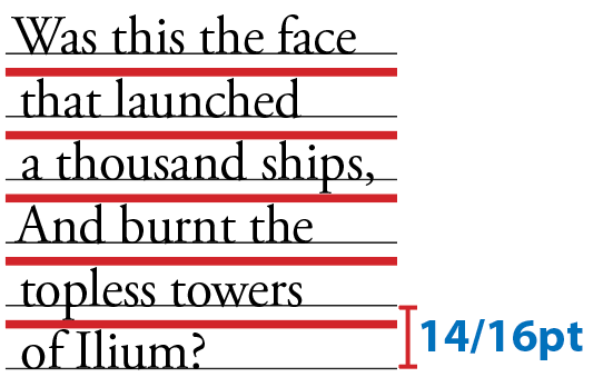 First, let’s define how leading is measured: The leading value of two or more lines of type is measured in points from one baseline to the next (Figure 1). This value is the sum of the point size of the typeface and the actual space between the lines. Thus, 10-point type with 12 points of leading really means there are two points of space between each line. This is written 10/12, spoken as “10 on 12.”