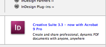 A year or so ago, I mentioned that CS3’s Welcome Screen had a dynamic area that could change from time to time. Well, it recently changed for (as far as I know) the first time. Suddenly, Adobe felt compelled to put a little notice about CS3.3 and Acrobat 9 in the welcome screen. I think this kicked in about a month ago, but I’ve been too lazy to take a screen capture until now: