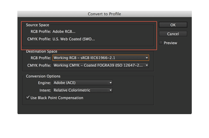 Did you ever need to know which ICC profile is assigned to your InDesign document? Unlike Photoshop, where it’s easy to find, in InDesign it’s not obvious at all. Some people believe you can view the current document’s profiles by choosing Edit > Color Settings, but this is not so; the Color Settings dialog box shows the default settings for new documents you create, not the current document. The easiest way to get this information is to choose Edit > Convert to Profile, where you can see the assigned profiles under Source Space (Figure 13). Be sure to click Cancel to dismiss this dialog box to prevent unwanted color transformations.