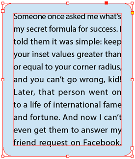Have you ever put text in a frame with a rounded corner effect? It can mess up the margins of the text at the corners. To avoid this, simply increase the inset value on the text frame to be equal to or greater than the corner radius (Figure 19).