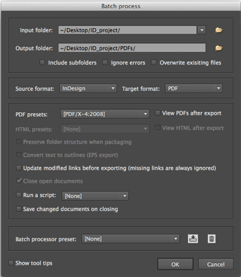 Have you ever had to create a bunch of PDFs from a bunch of InDesign files? Or maybe you needed to down-save a series of InDesign projects to an earlier version by exporting to IDML. These common situations can become tedious if you have more than a few files, since you need to manually go through the export process for each file. Thankfully, there is a fantastic free script called Batch Convert by Peter Kahrel, which you can download here. You’ll need to put all of the InDesign files into one folder. When you run the script, choose that folder as the input folder, and then choose where you want the converted file to be saved to (Figure 21).