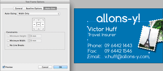 Ever have a situation where you want Phone, Fax, and Email listings to line up at the left, but the block of text has to be centered on a page, relative to the width of the email address? This can be difficult, of course, because email address sizes vary a lot. The solution? Auto-Size in the Text Frame Options dialog box. First, set up the tab stops as required (in my example, I used 17mm). Then, in the Text Frame Options dialog box, select the Auto-Size tab, and choose Width Only from the Auto-Sizing drop-down menu. Using this option, the text frame will take its width from the widest line of text. Typically (as in this example) this would be the email line, but if no email existed for this client, then the type would be centered on the phone/fax numbers (Figure 22).