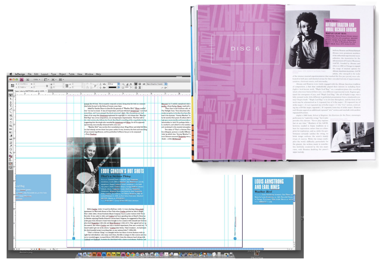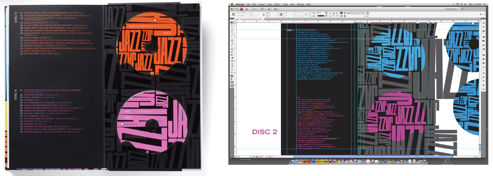 Klaetke, who began using InDesign with the first Creative Suite, says that “Adobe InDesign is our ‘go to’ tool for designing across different media and materials. Once we had the initial JAZZ type collage, we could bring it in to InDesign create the cover, slipcase, interior spreads, CD labels, poster, t-shirt—you name it.”