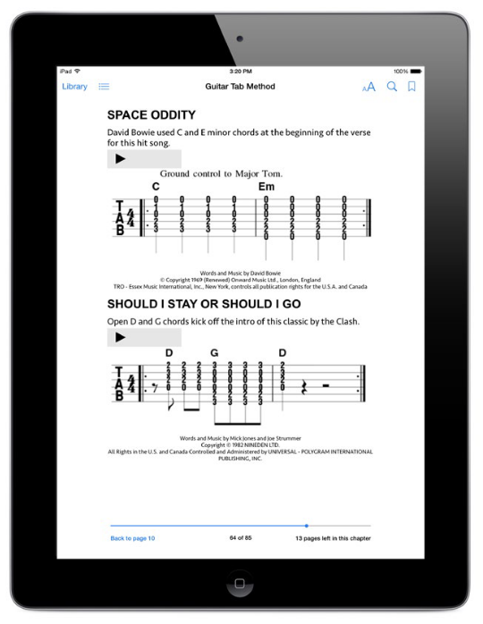 Screen shot from a Hal Leonard Guitar Tab Method iBook that features audio alongside the music examples. The book is exported from InDesign to EPUB format and the ebook team tweaks the CSS and adds audio files for a complete learning experience for the end user.