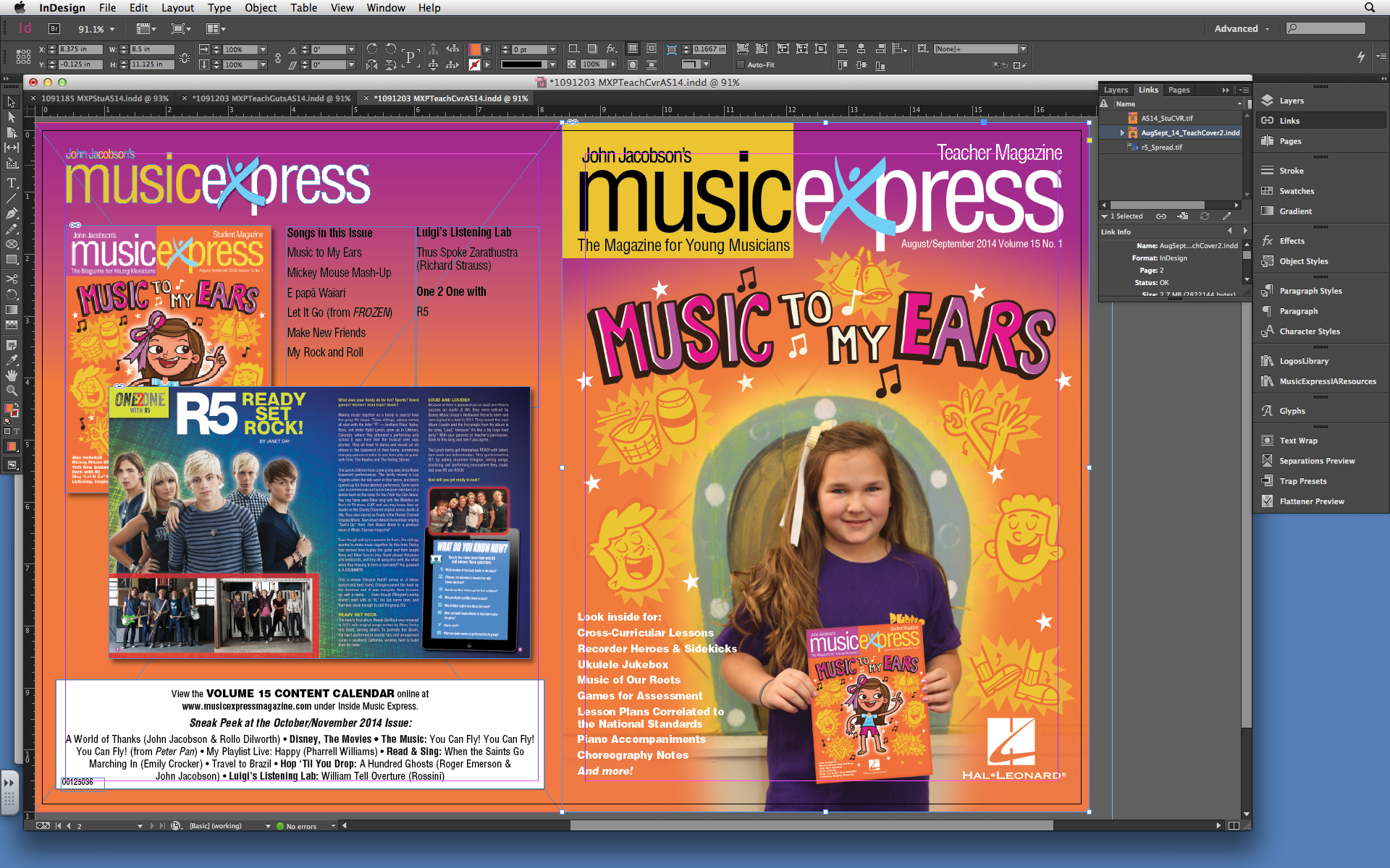 Spread from Music Express student magazine (of which Hal Leonard prints nearly 1 million copies each year). Each spread in the 16-page magazine is laid out by a different designer. The final magazine is produced by importing several InDesign documents into a single file. This file is sent to print as well as adapted for interactive presentation. You can see the imported audio files and video files on the left side of the spread. The complete magazine is exported as an interactive PDF and used on interactive whiteboads and video/computer displays in classrooms.
