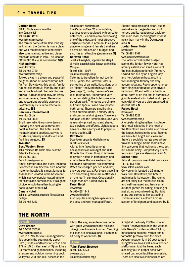 Insight Guides’ visual identity includes its page headers, which use strong colors to distinguish sections. “One feature of InDesign that we love is the split and span columns,” deRidder says. “At the back of our books we have a fairly dense section of text called ‘Travel Tips’ that contains practical information like hotel lists and addresses. Our design calls for either three or four columns of text, separated by a header that spans all the columns. This was incredibly time consuming to do before InDesign CS5.5, but this feature gives us a great deal more flexibility.”
