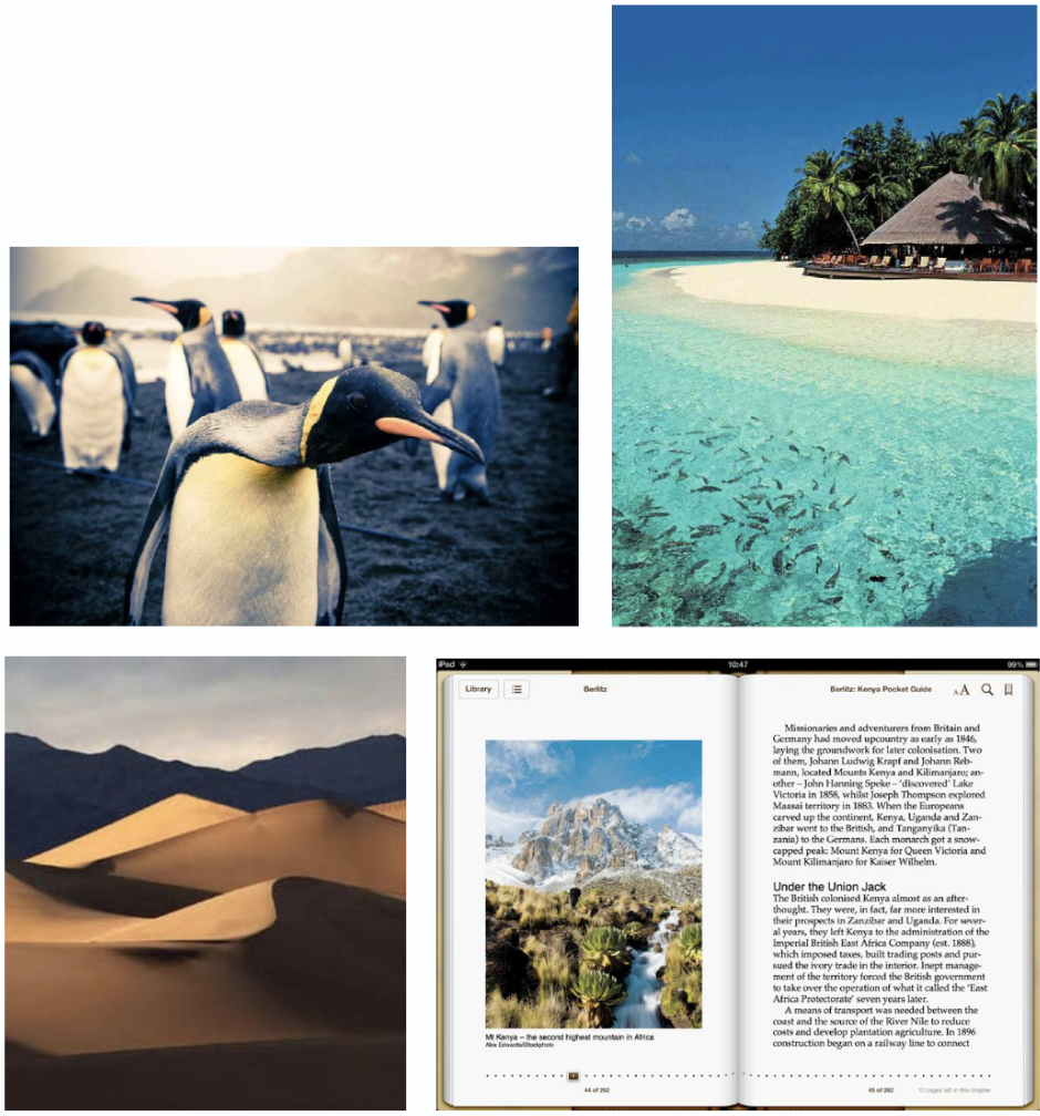 These images compare samples from Insight Guides’ print books with their eBook counterparts. The layout of the print version informs the eBook version. Note that the eBook sidebar “Dyeing to Make a Fortune” is opposite the map of the city, just as it is in the print version. Double-clicking the map brings up a full-page image. Similarly, the images in the second comparison are located as they are in the print layout. This fidelity between print and eBook versions helps keep the user experience consistent across formats.