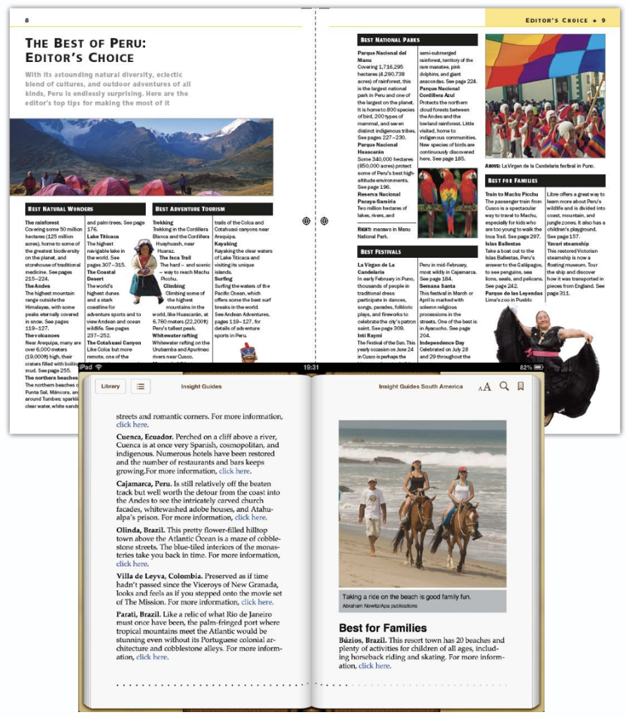 Insight Guides’ eBook content is designed for and proofed directly on the third generation iPad, which is the perfect device to showcase its beautiful imagery. Insight’s content is also available on Amazon’s Kindle Fire, but it lets Amazon do the conversion of their EPUB files to the Mobi format used by Amazon. That convenience will soon end, however. The release of the HD Fire has put another item on deRidder’s 2013 to-do list. “The introduction of the Kindle Fire HD is prompting us to convert in-house starting this spring,” deRidder says.