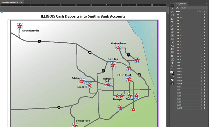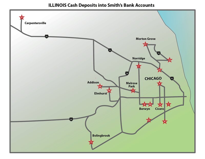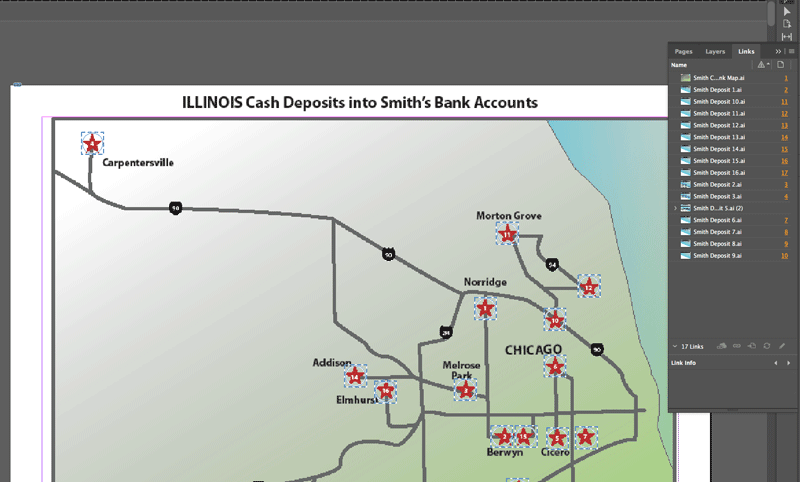 “For this type of criminal activity involving various layers of evidence, I usually begin with a master or main chart—in this case, it is the map that serves as the central part of the story,” said Johnson. “The other sixteen parts (the sixteen bank locations and the activity associated with each location) are supplemental.”