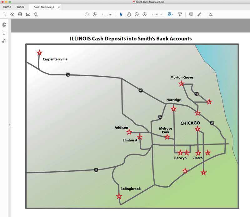 “Creating an accurate map of bank locations is crucial because the attorney will use the map to explain the concept of structuring bank deposits to the jury,” said Johnson. “The attorney will show that many banks were utilized within close proximity and that multiple deposits were sprinkled among many banks on different days to disguise the criminal activity.”