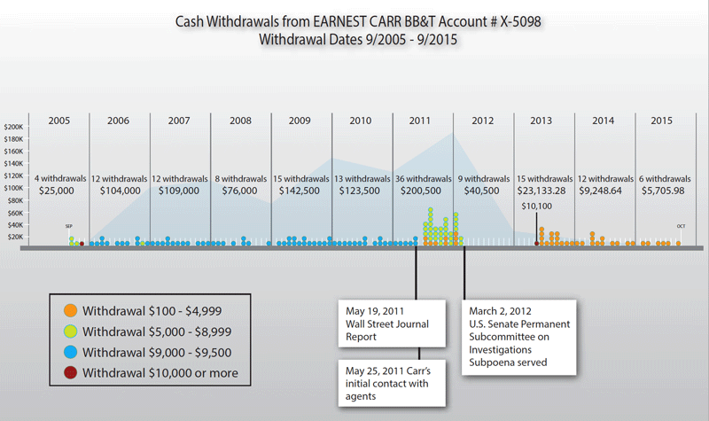 “The trial team wanted to show that the amounts of cash changed substantially after the IRS agent contacted the defendant,” said Johnson. “In other words, the defendant made regular cash withdrawals of just under $10,000, again, to avoid a red flag being sent to IRS, over a period of six years, and then once the IRS got involved, a lot of cash was withdrawn at first, and then the amounts decreased over time.”