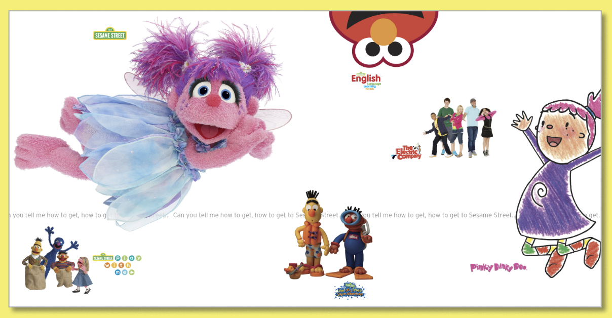 A large-format 10’×5′ (3m × 1.52m) event wall sign for the MIP Trade Show, showing Abby Cadabby and other characters from Sesame Street, The Electric Company, and Pinky Dinky Doo. Sesame Workshop produces many events, including fund raising functions, all around the world. These two pieces above were designed by Carol-Anne Ryce-Paul and produced by Sesame Workshop’s Creative Services department.