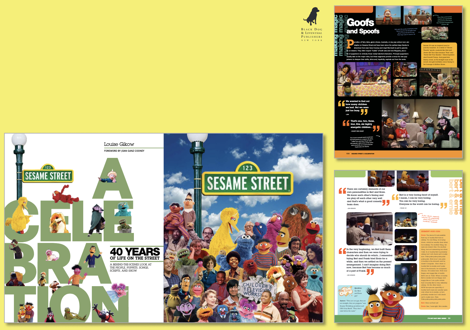 Sesame Workshop is producing a 40th celebration book, to be published by Black Dog & Leventhal on Nov. 10, 2009—the anniversary of the show’s debut. The book offers an unprecedented behind-the-scenes look at Sesame Street’s history, characters, and creators. Note that the book’s title actually prints on the back cover. Written by Louise Gikow and designed by Andy Taray/Ohio Boy Design, with art direction by Colleen Pidel.