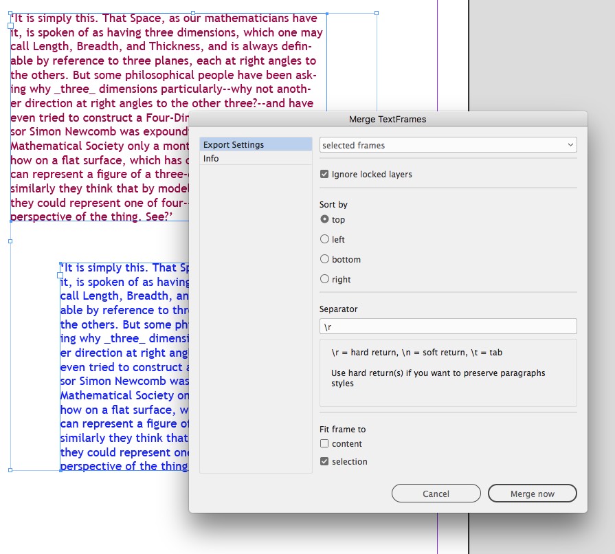 Version 2 of Merge Textframes adds only a couple smallish features, but they fill in some gaps from earlier versions. This version remembers the settings you entered previously, instead of reverting to the defaults each time. A seemingly small change, but it helps when running the same operation multiple times. Which leads me to another improvement: one-step undo! Previously, if I ran the script with incorrect settings, I would have to undo through each step in reverse. Now I can see my results and immediately undo if it’s not what I intended. Prior versions of Merge Textframes wouldn’t work with linked text frames, but now you can merge those frames to your heart’s content. And lastly, if you don’t want to drill down through the Scripts panel to find the script, you can choose it right from the Object menu.