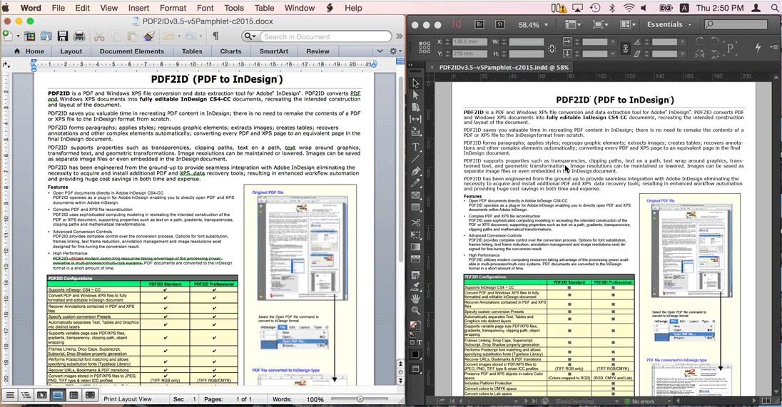 Exporting from an InDesign document is super simple, with the Recosoft menu and an Export to MS Word option added to the InDesign user interface. ID2Office also offers conversion options for managing threaded text frames, text styles, blank pages, and hidden layers. The resulting Word file, while not perfect, usually ends up looking pretty darn close to the original InDesign file. The process is certainly quicker and more accurate than the old “embed images, export stories, copy and paste everything else” method used by many folks in the past. In my tests, converting from PowerPoint and Keynote yields slightly odd results, especially when exporting a tall InDesign layout to the landscape presentation orientation.