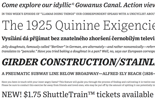 And because Frere-Jones is also a type historian, even someone like me can enjoy the history of how this typeface came to be. For this serif font, he took cues from Ionic, a precursor to slab serif, which sort of married each character to the next by way of those larger serifs. And though Ionic was first used in the 19th century, both typefaces are confronted with the problems of spread presented by printing on newsprint. Enter Bell Gothic from the 1960s: a sans serif font created for tiny print in phonebooks (remember those?). Frere-Jones took the internal stylings of Bell Gothic, like higher x-height and larger counters, and crafted those into Exchange. What was born from these spiritual parents separated by a century and a half was a typeface with the best characteristics of each, purpose-built for the less-than-forgiving surfaces they’ll be viewed on.