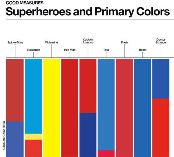 I particularly like the costume color ratio graph showing heroes’ propensity for primary colors, as the chart instantly brings to mind each mentioned character’s costume (Figure 4).