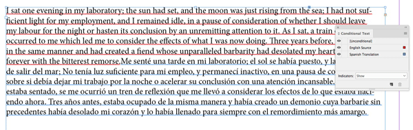 Having conditional text makes easy work of turning on and off the separate languages, which is a plus if you have other conditional text, such as independent pricing for each language. If working with conditional text makes layout and formatting more difficult, you could always choose to duplicate your text to a new layer, and then replace the text with the translation (thus maintaining the original text as well).
