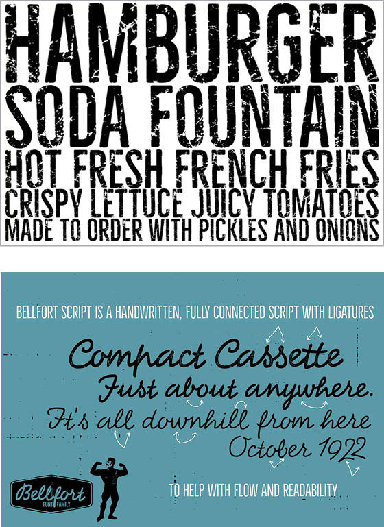 Font Bros is known for their large collection of display fonts, most of which are available for prices that don’t involve selling a vital organ. My favorite thing about their collection is that they’re categorized with monikers like “wacky,” “groovy,” “futuristic,” and “new wave.” Their Bellfort family straddles a few of the categories, mostly because this varied font family contains a whopping 25 fonts. From the distressed Bellfort Rough Demo to the quirky, handwritten Bellfort Script, the family is quite diverse (Figure 7).