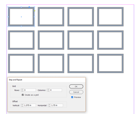 There are any number of ways to copy this frame and create our grid, but my favorite is Step and Repeat. With the frame selected, choose Edit > Step and Repeat. Enable Create As a Grid by clicking the check box and, if it’s not already selected, enable Preview as well.