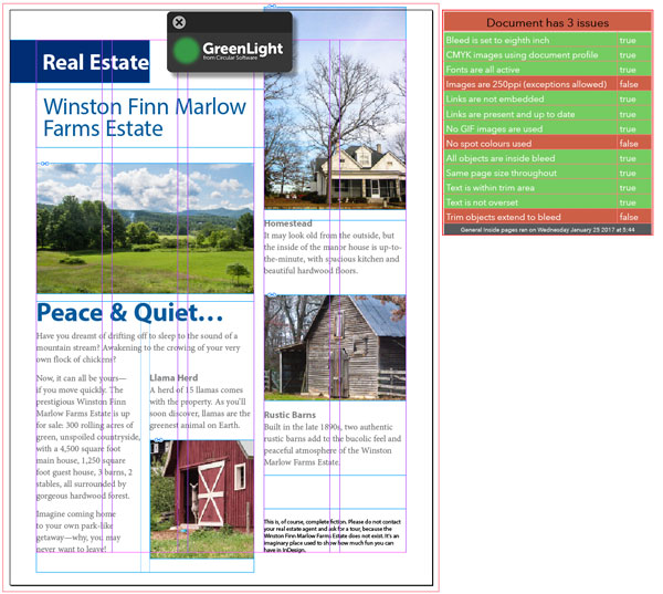 But GreenLight goes well beyond that. It can check to see if the document is named according to an in-house standard convention, that graphics are linked to a predefined location, and that images have the correct color profile. It can be set to squawk if, for example, the designer places an unwanted file type, such as GIF.