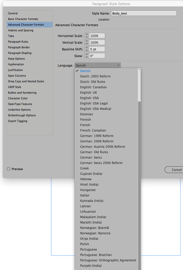 Figure 5. You can change the language setting in the Advanced Character Formats section of Paragraph Style Options.