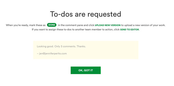 Figure 15: This screen in my PageProof dashboard explains how to mark To Dos when they’re done. There are also links to upload a new version of the proof or assign it to other team members via the Send to Editor button.