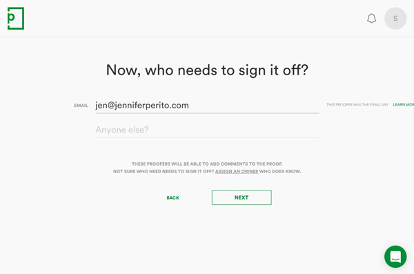 Figure 8: In the Proof Setup window, add the email addresses of final approvers who can comment on the document and ultimately have the final say. Clicking Next sends an email to all final approvers, letting them know a proof awaits their comments and approval. These reviewers don’t need to create an account to view and comment on the proof; they simply click the View Proof button in the email invitation.