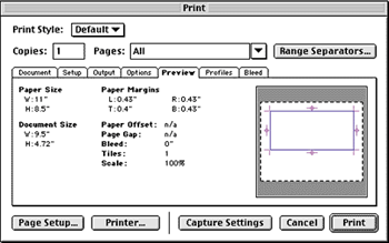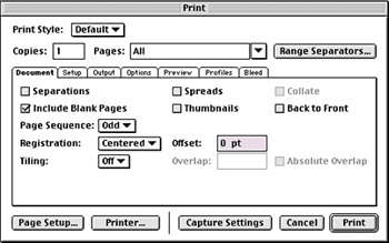 The front part of our insert consists of two document pages. However, we really only want one double-sided print that will fold in half to create four pages. To print a double-sided color composite, press [c]P ([Ctrl]P in Windows) to open the Print dialog box, as shown in Figure H. Select Odd from the Page Sequence pop-up menu and select Centered from the Registration pop-up menu. Enter 0 pt in the Offset text box. Then, from the Setup tab, select the appropriate printer. The Preview tab, shown in Figure I, displays how the page will print. Click Print.