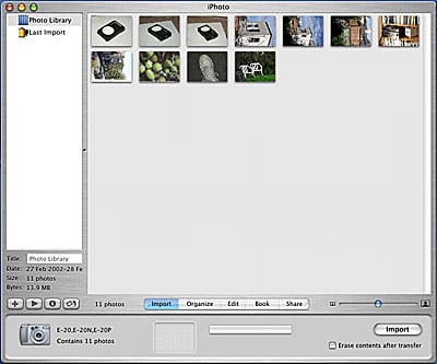 Tabs near the bottom of the screen switch between iPhoto’s five different modes: Import, Organize, Edit, Book, and Share. When you plug in a camera, iPhoto automatically switches to Import mode, tells you how many pictures are on the camera, and offers an Import button for transferring the images. The program also provides a handy option to automatically erase the images from the camera after importing (see figure 1).