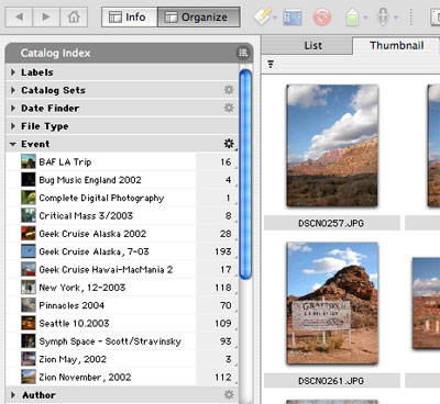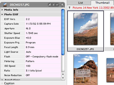 With version 2.6. MediaPro’s main interface has been streamlined and re-organized. Two simple tabs let you switch between viewing your catalog as thumbnails or in a list, while a third lets you view your original media (assuming it’s available; if it’s not, then MediaPro will prompt you to mount the appropriate volume). A collapsible pane on the left side of the window provides two different sets of data. The Info view lets you view all of the metadata information about the selected item. This includes not only metadata information that you might have added — keywords, XMP annotations, etc. — but any EXIF information that your digital camera might have included with the image.