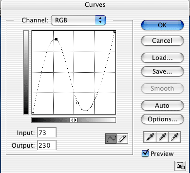 You will see a diagonal line cutting through the graph. Click about a third of the way from the left and drag the line up. Then click about a third from the right and drag down (Figure 15). If you can’t see any change in your image, check the Preview box in the Curves dialog box. Make fine adjustments until your chrome looks good.