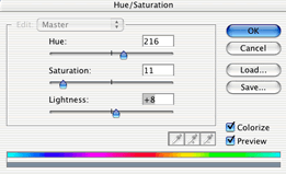 Go to Image > Adjust > Hue/Saturation (Cmd/Ctrl+U). Click Colorize and adjust as shown in Figure 16 to produce a slight blue hue to the interface. This makes it appear more like chrome.