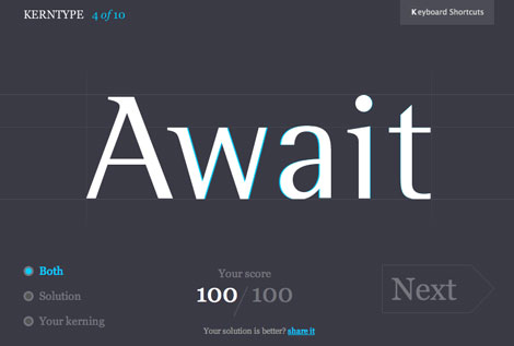 The site offers interactive kerning practice where you drag letters within words to distribute the given amount of space. When you’re finished you can compare your results with those from a professional typographer, and you are awarded a score based on how close you were to matching the pro’s solution. You can also share your solution if you think it is actually better than the pro’s.