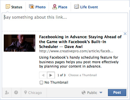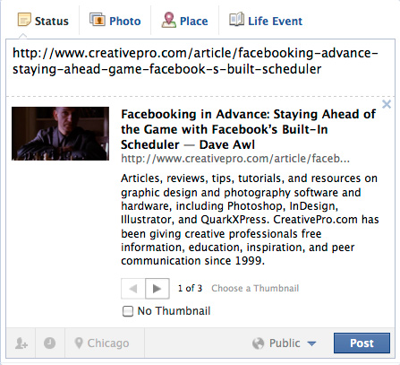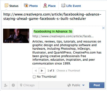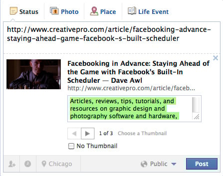 Here’s an example. Let’s say I want to share my previous article for CreativePro on my Facebook Timeline. When I first paste the URL of the article in the publishing area, the link preview that Facebook automatically generates looks like this: