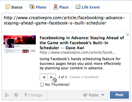 But that still leaves one element of the preview that can be customized: the thumbnail image. Some links that you post will have more than one image available as thumbnails. If that’s the case, clicking the arrows at the bottom of the preview area will let you navigate through the available options, so you can choose the most relevant or appealing image to accompany the link.