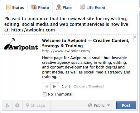 For example, in the shot below I’m posting a link to my business website, Awlpoint.com, and I’m leaving the URL in to help publicize it: