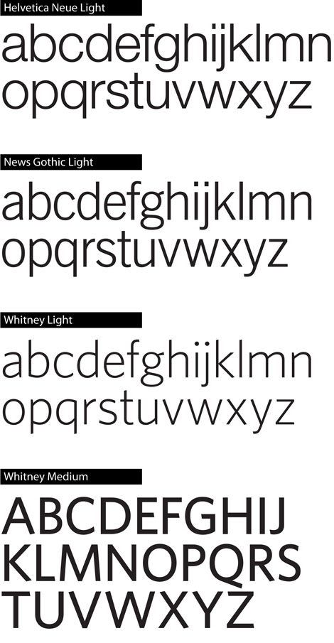 Is that wrong? No, but all the Helvetica Neue characters have a sameness to them that I don’t care for (and don’t get me started on Helvetica). Then, take a look at News Gothic Light, which I think was used as a reference by Frere-Jones in designing Whitney. Look at the lowercase c — whoa, those terminals are not going to seamlessly butt into each other. They tilt out and, if extended, they’ll cross but they’re not going to reconnect. The same applies to the News Gothic Light lowercase e — that terminal is barely going to graze the bowl if extended. And look at the bottom of the vertical strokes in the lowercase b and d: They’re tapered, as is the upper part of the vertical stroke in the lowercase p and q. And I say, right ON! We have personality! We move away from the way so many people think of sans serifs: boring, monoweight strokes.