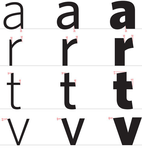 Whitney is different from many other sans serifs. If you look at Helvetica Neue Light, you can see that its terminals (the ends of strokes) are cut either horizontally or vertically. Also, looking at its lowercase c, for instance, you can see that it looks as if a lowercase o was taken and a section of it was chopped out to create the lowercase c. You can take a pencil and fill in that gap and have yourself a lowercase o: