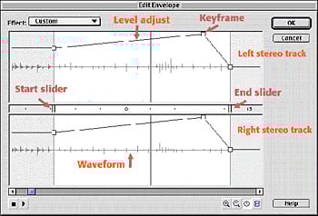 Now it’s time to refine the music track you just built. Maybe you want to start the music at a later point in the song or maybe you want it to fade out at the end. Flash 5 offers a selection of pre-built sound effects in the Sound window shown above, or you can create your own custom effects. To do that, select the Edit button in the Sound window; the Edit Envelope, shown in the figure below, appears. This is where you can set the start (or in-point) and end (or out-point) of the song by dragging the sliders indicated in the figure below. You can also adjust the volume, or level, of the track by dragging the Envelope controls up or down. Experienced sound editors will find these tools crude, and complicated sound editing is best done in a dedicated sound-editing application, such as Sonic Foundry’s Webmaster Bundle or DigiDesign’s ProTools 5.1.