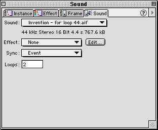 Anyone with any experience in Flash knows that the biggest challenge is keeping file sizes small. Adding long audio tracks is a guaranteed way to increase file sizes and download times. One way to keep your file small is to repeat a smaller piece of a song over and over instead of using a long track, a process known as looping. In Flash, loops save the most space when they are created with event-based sounds. The beginning of the track we used above, “Invention,” is an easy piece of music to loop. To do this, from the menu bar select Window > Panels and then select the Sound panel. Enter a number — five, for example — into the Loops dialogue box. Also, change the Sync from Streaming to Event. Then select the Edit button and use the sliders in the Edit Envelope to select in and out points for your loop. The play button at the bottom of the Edit Envelope will play the loop and reflect the in and out points you select. One caveat when it comes to loops: They can become very annoying if overused. Proceed with caution.
