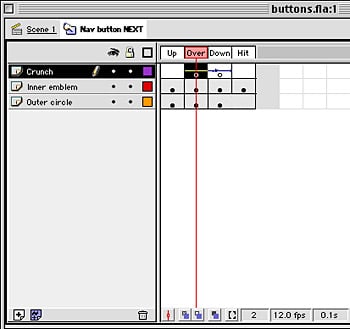 Probably the most common use for event-based sound is to add a “click” or other sound effect to a button. Simply open the button in the Symbol Editor (see figure below) and add a new layer for the sound effects. Insert a keyframe where you want the sound to play and, with that keyframe selected, go to the Sound Panel, select a sound effect from the Library, and edit it as described above. The buttons used in this article have two sound effects: A roll-over sound effect helps identify the object as a button, and a mouse-down sound effect lets the user know that they’ve activated the button. Having different sound for different actions helps orient the users to understand the buttons’ use.