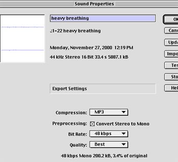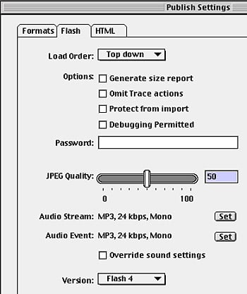 Once you’re done adding sound to your Flash animation, it’s time to export, or publish, your animation. From the File menu in Flash 5, the Publish Settings dialogue box lets you choose how the overall audio in your project is compressed. The standard for Web delivery is the ultra-compact MP3 format in mono. Through trial and error, we’ve found that a bit rate of 24Mbps offers a good compromise between quality and file size.
