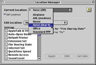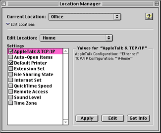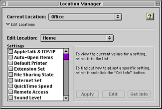 To set the File Sharing portion of the Location Manager for your home setting, click the Edit button and then open the File Sharing control panel and turn off file sharing (unless of course you’re on a network at home). Then, close the control panel, return to the Location Manager, and click the Apply button to add it to the settings. Similarly, set the Sound Level, Internet Set, QuickTime Speed, Remote Access and Time Zone items in the same manner.