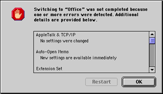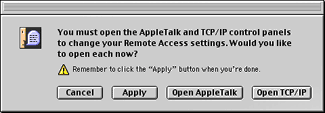 As you can see, setting the Default Printer setting is relatively easy. Now, let’s go to the next step and create networking settings for both the Home and Office locations (the system settings can be created independently of the location configurations). To do so, select the AppleTalk & TCP/IP setting and then click the Edit button. When you do, the message box shown in Figure C appears. From here you can open both the AppleTalk and TCP/IP control panels. (Also make particular note about the Apply warning. It isn’t fun to go through the process only to find out you have to start over.) Now, click the Open AppleTalk button and then when the dialog box appears, select the appropriate means to connect to your network from the pop-up menu.